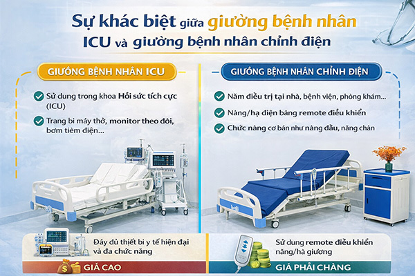 Giường chỉnh điện chủ yếu hỗ trợ thay đổi tư thế phục vụ sinh hoạt, trong khi giường ICU phục vụ điều trị chuyên sâu. Giường ICU có độ ổn định cao hơn, khả năng chịu tải lớn và hỗ trợ gắn thiết bị y tế trong môi trường hồi sức.
