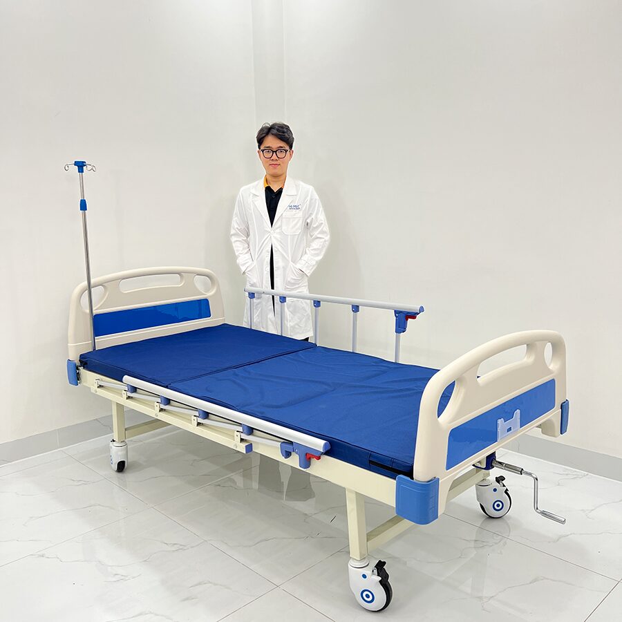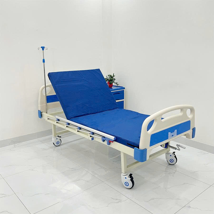 Giường bệnh nhân 1 tay quay là loại đơn giản nhất, cho phép điều chỉnh một chức năng duy nhất, thường là nâng đầu hoặc nâng chân.