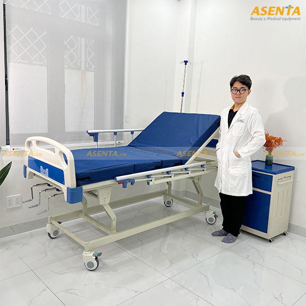 Giường bệnh nhân 3 tay quay được bổ sung thêm chức năng điều chỉnh thân hoặc lưng, giúp bệnh nhân ngồi dậy vững hơn, hạn chế trượt người về phía trước.